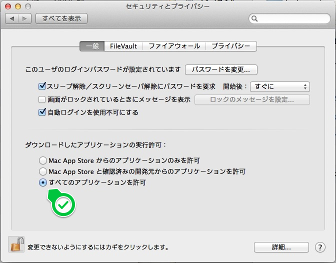 なお、OS X 10.8 Mountain Lion で搭載された Gatekeeper 機能によって、アプリケーションの実行がブロックされる可能性があります。 その場合は「システム環境設定」を開き、「セキュリティとプライバシー」内の「一般」タブより、「ダウンロードしたアプリケーションの実行許可:」にて「すべてのアプリケーションを許可」を選択してください。